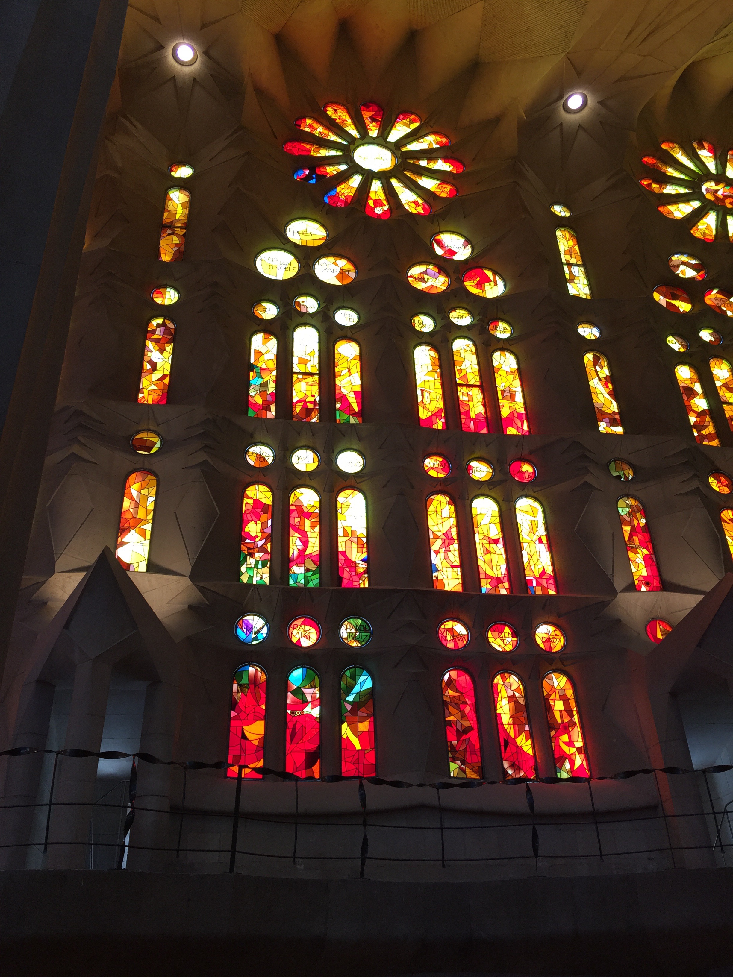 Upon entering the church you’re immediately struck by the incredible height and lift of the room. Silvery and reflecting natural light the ceiling soars, an ethereal canopy supported by grand columns that narrow at the top and burst into branches at their apex. Our guide explained that the columns are made of varying materials based on the load each bore. Sandstone for the smaller ones, then granite and finally porphyr for the four huge main columns that support the entire structure. One you can pull yourself away from the ceiling you realize that you are bathed in the glow of a rainbow of stained glass infused light. As you get deeper into the church you’ll also see the two main sides of the stained glass are distinct. The side that receives the morning sun is all gradations of cool blues and greens while the opposite sunset side evokes the warmer yellow, orange and red warm hues. Rather than depict the saints visually their names are written within the panes. Above two balconies are perched on both sides to hold 800 choir members so that their voices lift from the upper areas of the church. The spires being created are planned to produce music that can be heard from around the cathedral. The shapes and designs within the building seem whimsical yet evoke the intricate geometry and mathematical patterns found in nature, then each unique design element is linked to the story of Jesus, his birth, death and resurrection. It was not lost on me how special it was to visit on Holy Week.