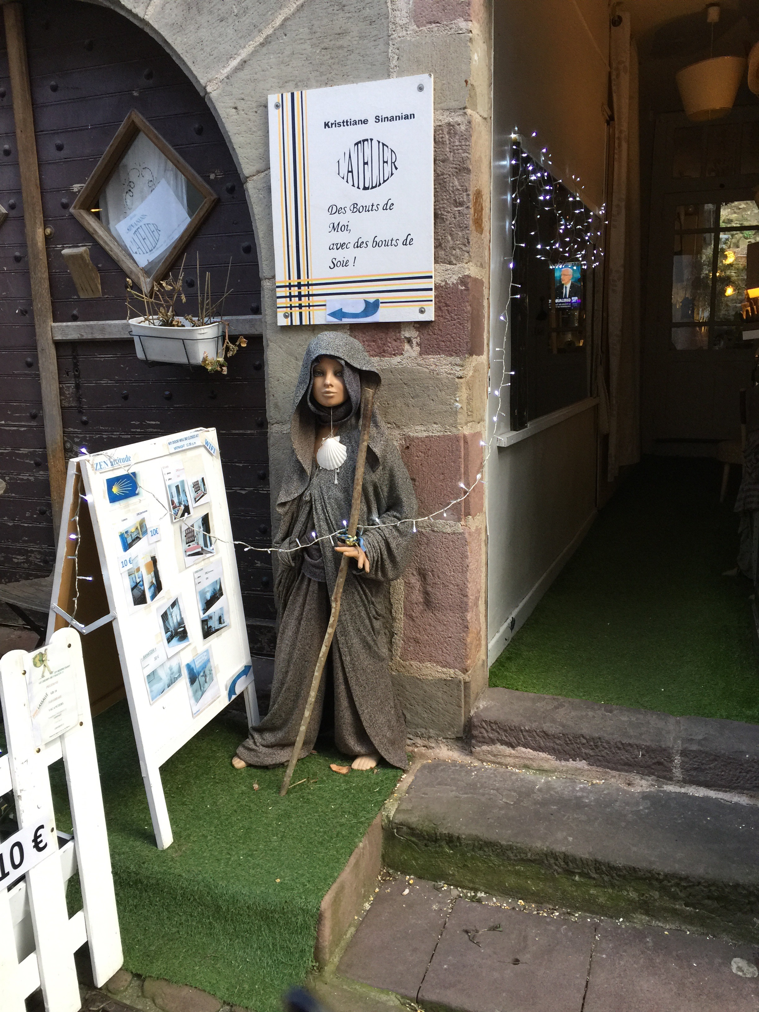As we walked through town I was slightly jealous as I saw a group of pilgrims gathering for wine and a meal in an auberge setting, they looked super comfortable with thoughtful details like old hiking boots filled with flowers hanging over the window. Just two doors down there was a very different display, two mannequins dressed as old style pilgrims atop green AstroTurf with blinking Christmas lights. There’s really a unique experience available no matter what you’re looking for…