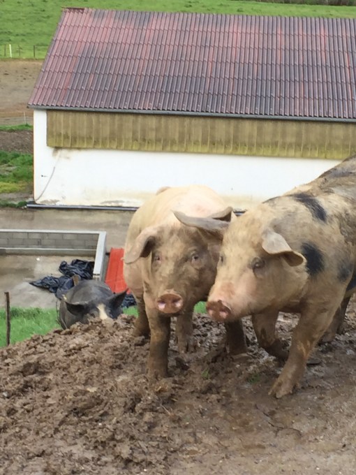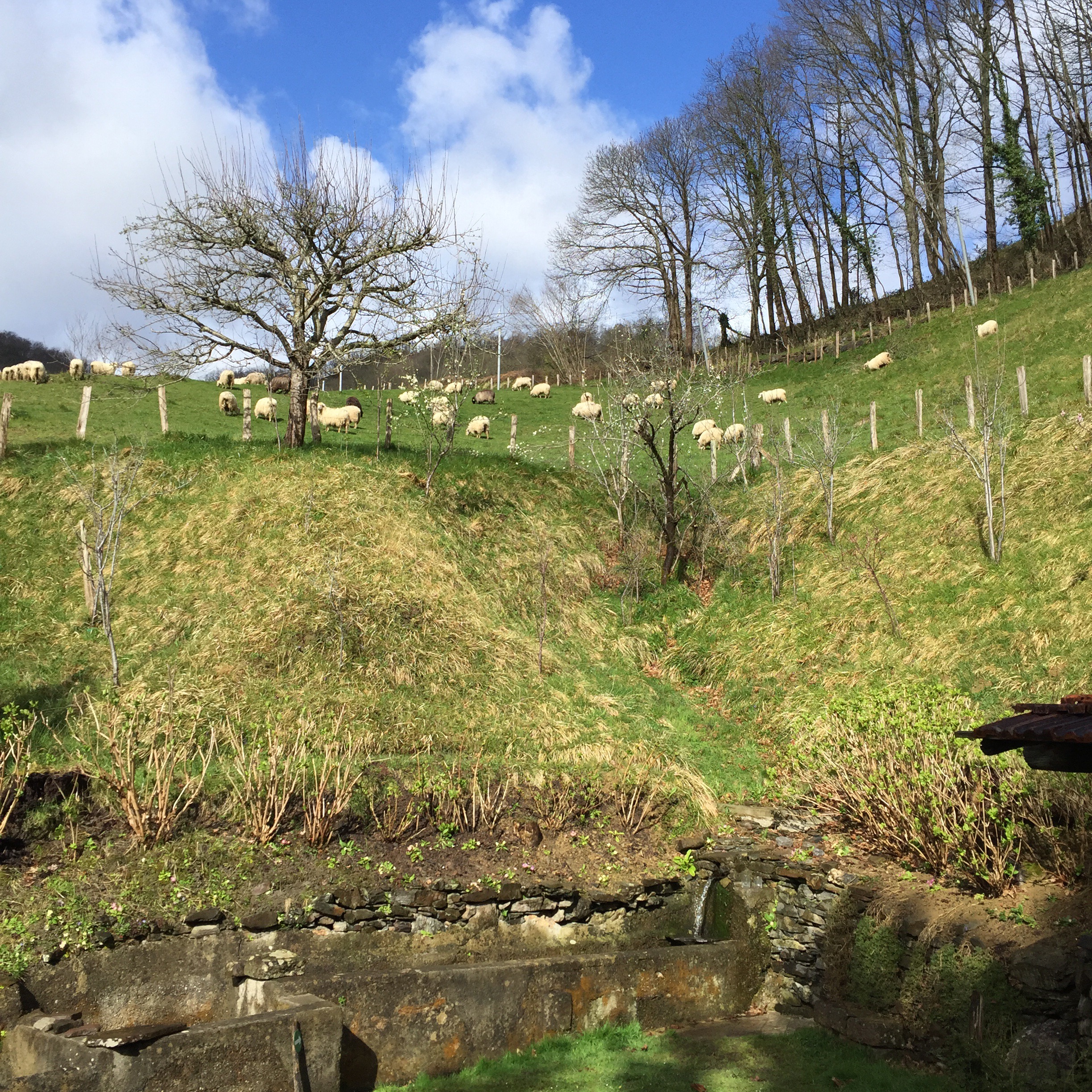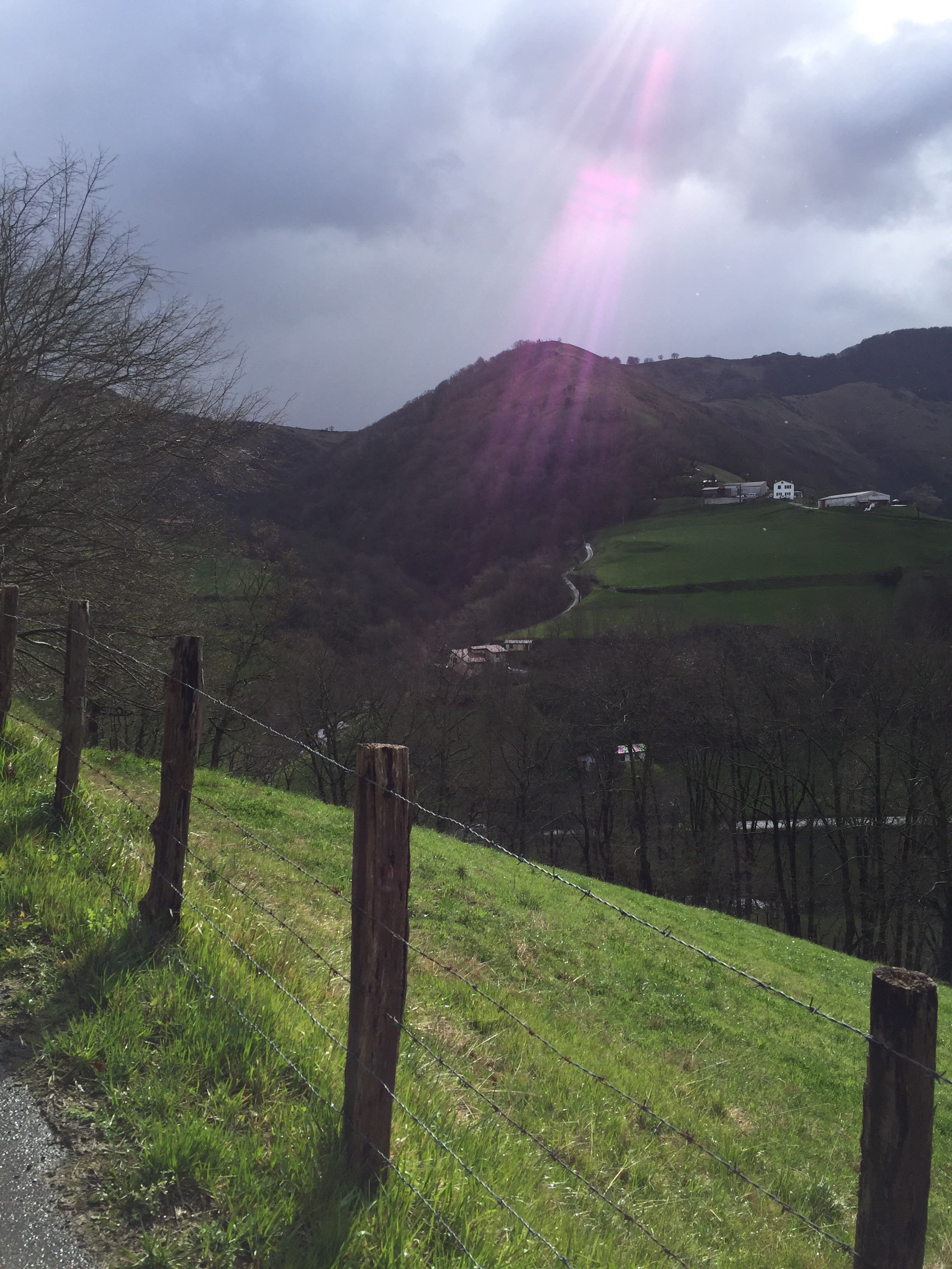 Phew, we arrived in Valcarlos after an intense hike from St. Jean Pied de Port, 3 hours and 20 minutes only stopping twice for some water. The route took us out the gate of SJPP and through lots of farmland and then forest. Most of it was backcountry roads but one short stretch was right on the muddy grassy shoulder of the main highway. When we began it was hailing and dumping rain and then it would clear up a bit before dumping on us again. We passed farms where sheep grazed and pigs made love, amazing magnolias and forsythia in bloom, wild violets and mountain peaks covered with snow.  The farms provided a soundtrack of braying cows and chattering chickens and we would get wafts of the smells of fertile soil, and the various manures of the animals, each one distinctly different, and not entirely unpleasant. Gotta say I was pretty excited to finally witness the male pig’s unique corkscrew anatomy that I’d been warned of by college roommates including Robin Hopwood and Deb Stull. As I took some racy porcine video footage Suzy, my walking companion, was worried I was at the gateway to producing animal porn, but it’s just nature folks.