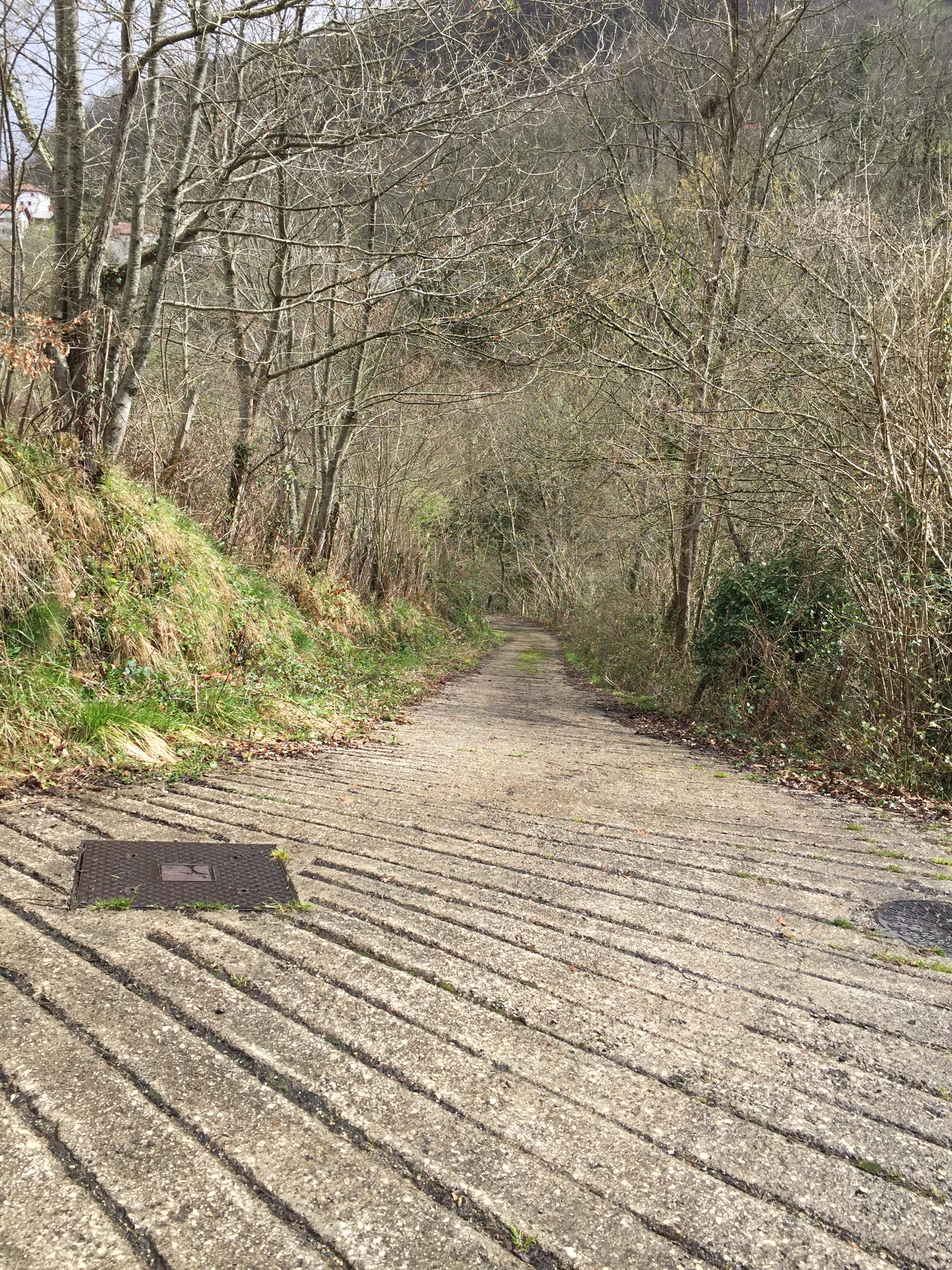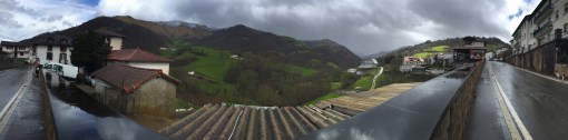 I’m glad we did, at the end of our journey we had to descend all the way to the river and then back up to the town of Valcarlos.  The slope was a ridged pavement covered in leaves.  It was incredibly slippery from the rain and wet leaves and steep! I was so grateful for my poles and even leaning all the way over into the grade found myself almost slip twice. Seconds after we reached Valcarlos and entered our apartment at Apartamentos Mendiola the ominous cloud that was behind us reached the town and from our spacious kitchenette we watched a ridiculous hailstorm.