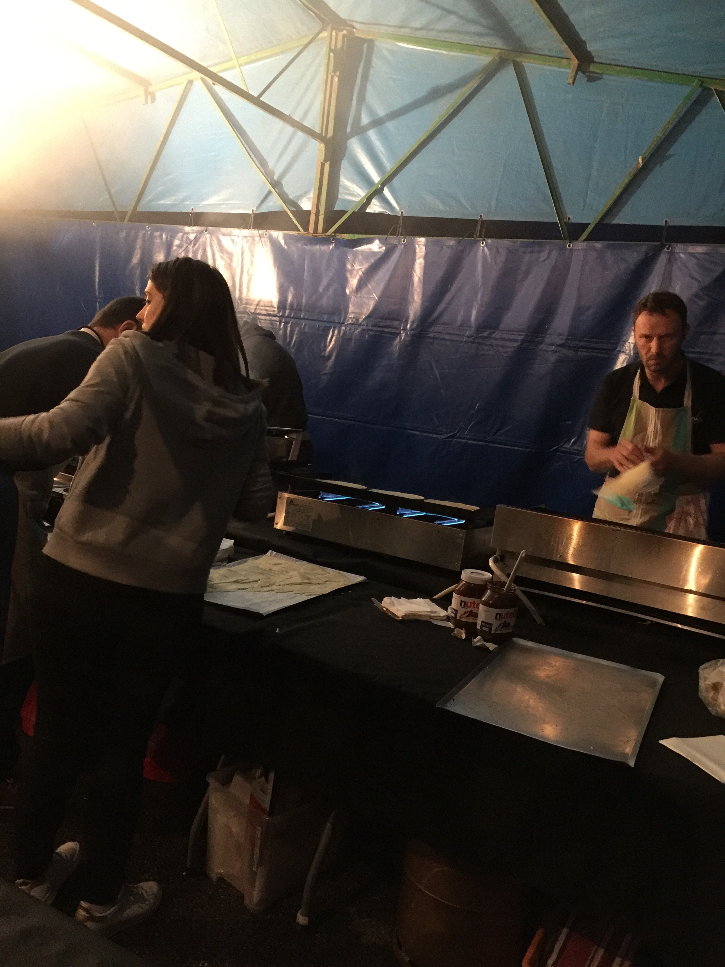 After it was done the sun came back now it’s outing again the fourth time in a crazy cycle. I ditched my boots and socks and put on some Crocs at the apartment and went for a bite at Ardanegia, a cafe with their own wine. I got some hot fried gambas and French fries. This place has a vibe like a Spanish Big Sur, the cute cafe is attached to a grocery store and teeming with locals and lots of tourists in Camino gear.  I was so glad we didn’t have a full breakfast this morning or stop for lunch in Arneguy, nothing looked open anyway…We would have gotten stuck, and thank goodness weren’t on the way to Roncebvales with each of the squalls rolling through it would Have been totally miserable. After a few naps helped by the patter of more rain we headed back up to Ardanegia as our host told us if a celebration that was to happen on the eve of Easter with dancing and some special food.  As we enjoyed beers and watching all the locals it became clear that the fete was cancelled due to weather but we got our Valcarlos stamps at the grocery and headed out into the town to see two men on horseback riding down the middle of the highway.  They implored us to stay for the festival the following day.  Around the comer from the church we saw the large gathering and joined in buying more beers and the local special food for the event which was a tortilla like wrap with bacon, chorizo sausage , cheese or Nutella.  Delicious and only 3 Euro or 3,5 for two items.