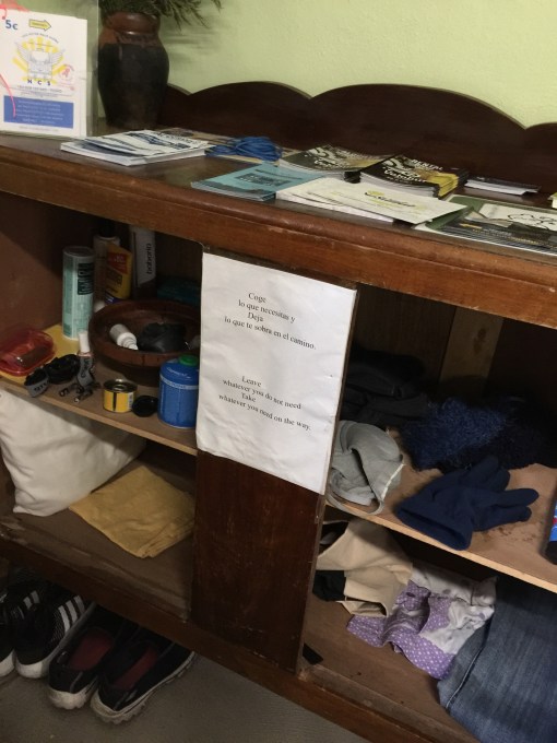 Immediately upon entering the town we found an adorable little stop, a local artisan has set up a shop and rest stop in her kitchen. You can stop and warm up around the wood burning stove that is heating the room, the owner will make you some food or you can just grab an egg or an orange, a coffee, beer or wine. The place has a great feeling complete with the homey atmosphere and the exposed wood beams and concrete slab floor. There’s even a pilgrim Take it or Leave it pile where you can ditch stuff knowing if will be used by another pilgrim or maybe find something you need. There are also 16 beds upstairs if you’d like to stay in this town. We purchased some of her bracelets that she makes over the slow season.