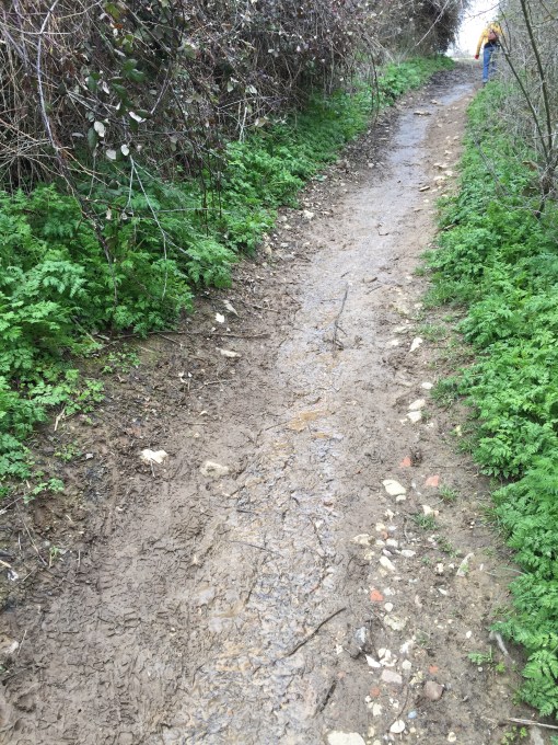 When we thought we were done we noticed more water streaming past us and kept going. Finally there was a slope down but to our dismay it appeared to then go directly back up. I tried to oretend that it must veer off and not go straight up but when we got to the base not only did it go back up to the same level of the ridge we’d just been on, but we were also presented with a tiny wooden bridge covered in stones and running water. It was like a joke.