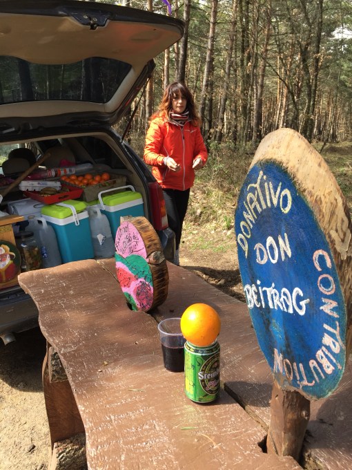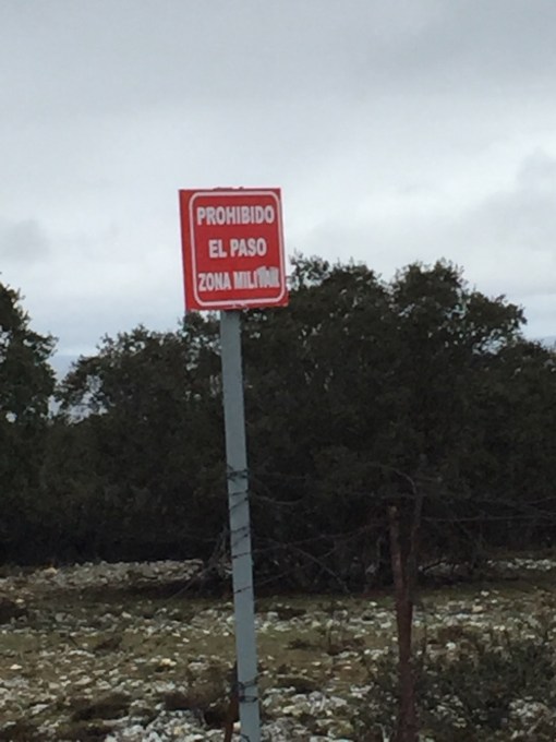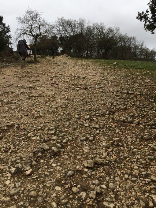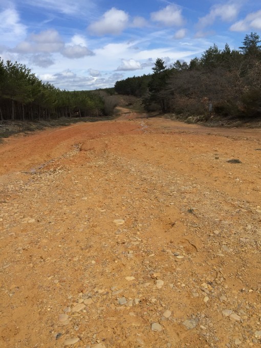 This top area provided a great view before our descent and circular rings made from the fragments of rough boulders that we’d just seen. The large gaping hole in the military fence and tire tracks gave us something to imagine…maybe this was the Area 51 of Spain and the gunshots that we’d heard weren’t open Pelegríno season but rather them shooting at the alien who’d escaped when they towed the mother craft into the secure zone. These are the ways we prevent boredom on the route. We let our imaginations run wild to keep the feet moving!