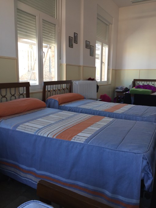 The nuns checked us in, the first we met was named Guadalupe she told me when I showed her the Virgen de Guadalupe necklace in my pouch. We were presented with a Virgin Mary pendant and the cost to stay is 5 Euros! That place is airy and bright and spotless although they’re doing a lot of construction outside. All the beds are on one level if the high ceilinged rooms, formerly a girl’s school. I showered and dealt with some more toe surgery… seems like my nail is raised and split and causing the problems. I’m cautiously optimistic that I’ve cut off enough nail and skin to fix it.
