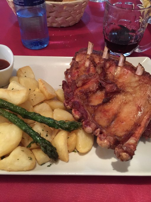 Anyway I got clean and took a brief nap after a precarious climb onto the top bunk. It was cold as there is no heat this time of year, and the windows were open in the rooms, but they did have a wood stove going in a room where you can hang out and eat. We were able to get more snacks at the grocer later. We left our laundry with Carmen, for 9 Euros she washed and dried our stuff leaving just a few light weight items for us to dry on the line. I was so grateful as my stuff was filthy. The black pants were stiff with mud and the magic shirt was losing its magic… we headed into town for dinner and ran into Sina and Friedrich who were eating at a cute spot. We went in and had an amazing meal, a rack of pork ribs with potatoes, wine, bottled water and dessert for 10 Euro.