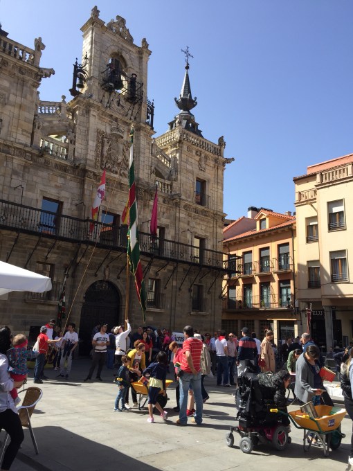 Soon after our short rest we saw the town of Astorga laying below us. Suzy initially thought she’d get cash in Astorga but wouldn’t you know it it was a regional holiday in Leon so even though it was Monday everything was closed. Upon approaching the main square we found the town bustling with energy and a flag balancing competition was going on. After a quick bite and a beer we were off again.