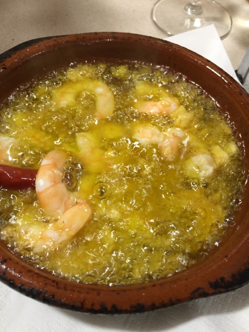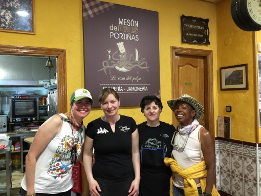 This place was amazing. We ordered two white wines to celebrate getting cash again and they gave us tapas of chorizo in cider. Then we ordered gambas al ajillo (garlic) and pulpo and it was honestly the best pulpo I’ve ever had, just chewy enough, perfect texture and spice and the gambas? They came out in a sizzling platter with tons of olive oil and garlic and we had brown bread to sop up all the oil. So decadent. We ordered two more wines (the wine portions are small here, honestly) and got a potato tapas with fries ham. When the chef came to see if we liked it all we asked her to recommend one more thing so we got the chichos, a chopped up loose Pork sausage like thing, so delicious. I’m so glad we found this place, Meson del Tres Portinas, it’s well worth a few blocks off the route.