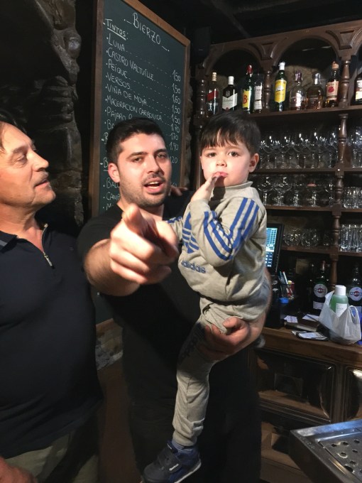 Once we gathered our clothing it was out to get our meat on. They served us a delicious joven wine, youthful and bright, tart very vibrant violet in color and perfect in its simplicity with this meal. They presented us the steak raw for approval. It was awesome. They served it with a blue cheese sauce and sun dried tomatoes. Carlos, Carlos and “mini” Carlos posed for a photo. We headed back to bed happily satiated. We are going to make a small jump tomorrow to try to get to a spot where Jean is scheduled to be working as a hospitalero later in the week, see if we can shave off some time.