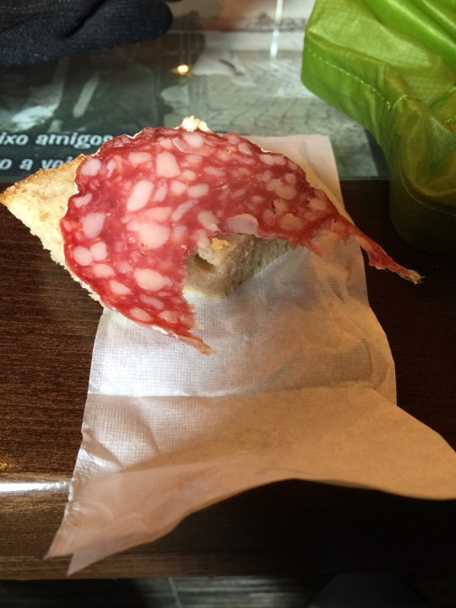 She, Natalia, came out with a plate of warm slices of bread each with a great piece of sausage on top. She presented one to each of us. It was just what we needed.