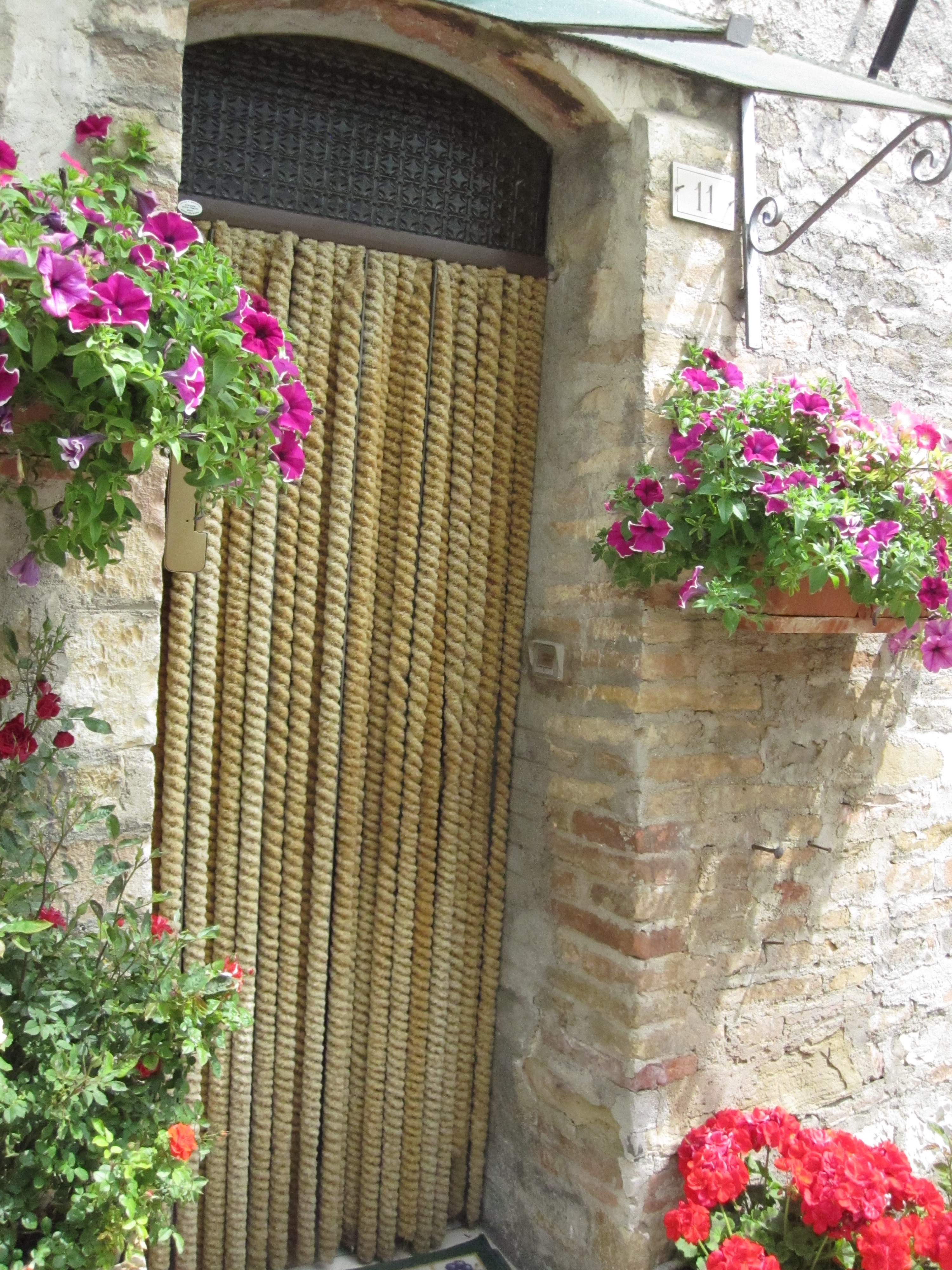 In fact it was rather quiet, but the coffees were great (four espressos and a plate of Italian style cookies for less than 4 Euros). Then off to the 14th century church of St. Francis (San Francesco) where you can see the amazing frescoes painted by Benozzo Gozzoli as well as the “Nativity” by Perugino. Apparently this cycle of frescoes was comparable only to Assisi but contains twelve images only. The colors of these frescoes are really amazing and some criticize their restoration saying that they cleaned them too much and that the green colors are exaggerated, but the impact is significant. Gozzoli was painting these in a much different style than the frescoes painted at the Basilica of St. Francis and so the figures are much more attractive and often blond and fair skinned which was the trend at the time. The museum that houses these gorgeous paintings also houses the ancient monk’s wine cellar with channels cut into the stone to catch the wine as it comes out of the presses and collect it into a trough. We strolled through the medieval town noticing the incredible pride people have in their flower pots that surround the entryways of their homes.
