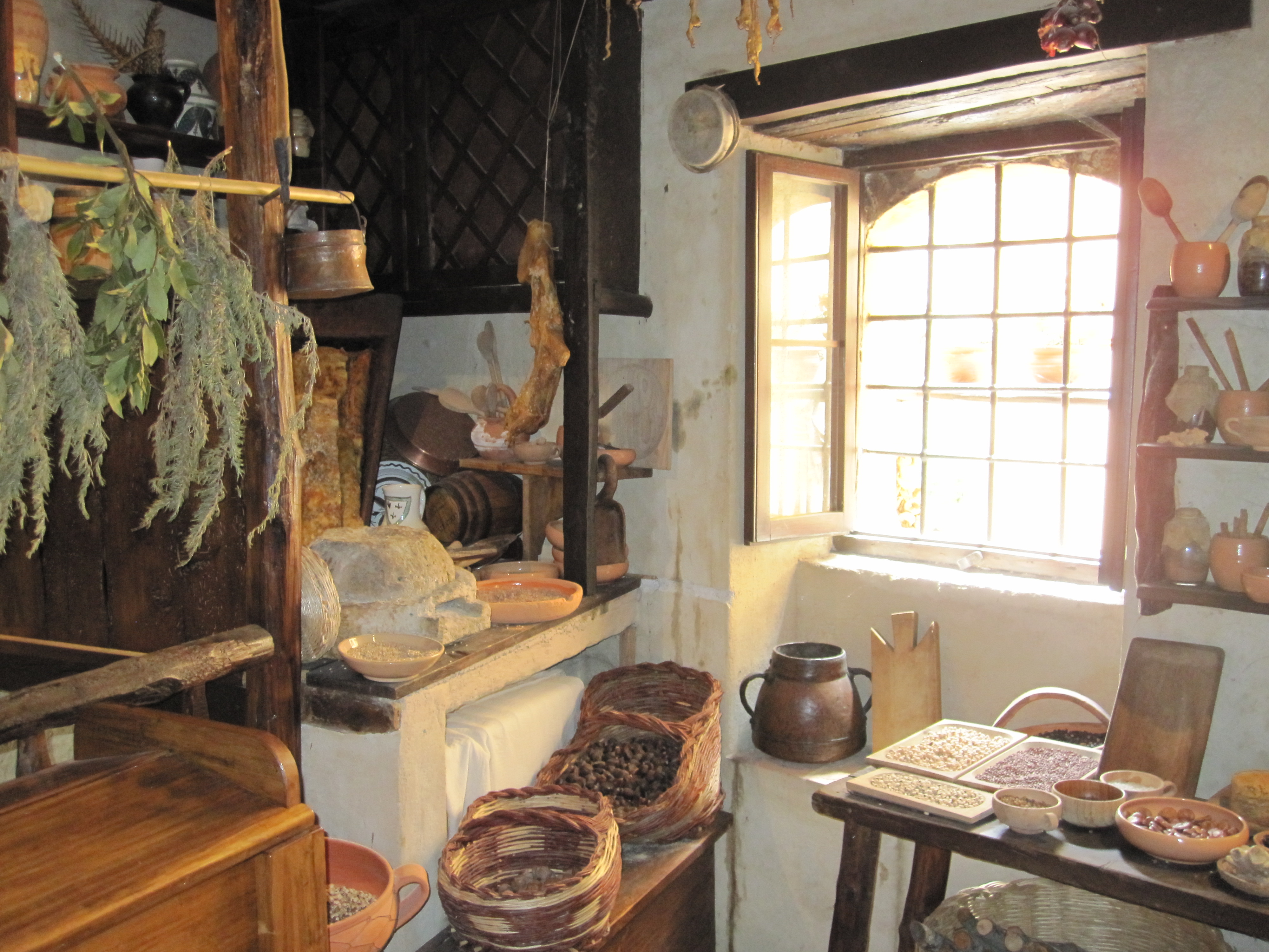 The area of Bevagna is fortunate to be at the confluence of multiple rivers and was able to sell their production of hemp, eggs, and bricks to neighboring towns. Within the town there is an amazing excavation of the Coliseum area. This former stadium was in ancient times closed and divided and turned into what we would today call work lofts, craftsman’s shops on the ground floor and living quarters above where they were safer from attack. We visited this Casa Medioevalle with our guide Annalita who helped restore one of these ancient work residences with a friend. Amazingly they have recreated a water wheel machine that would have either pounded materials to make mortar, felt or paper or run a wheel that would grind flour or olive oil (here the machine does both just to show us, but this would not have been the case back then). Upstairs you can visit a traditional Roman home where the kitchen it attached to the rest of the room in order to conserve heat. Hearty stews were made with small pieces of lard that hung from the rafters, in fact everything was hung, meats, cheeses, etc. Bedrooms were painted bright colors in the spring since throughout the whole winter they burned animal fats for warmth, you can imagine the smell, and most had tuberculosis so they actually had a tiny bed where they slept sitting upright in order to prevent suffocation. These structures actually date back to the 2nd century AD, it was really interesting to try to imagine life back then.