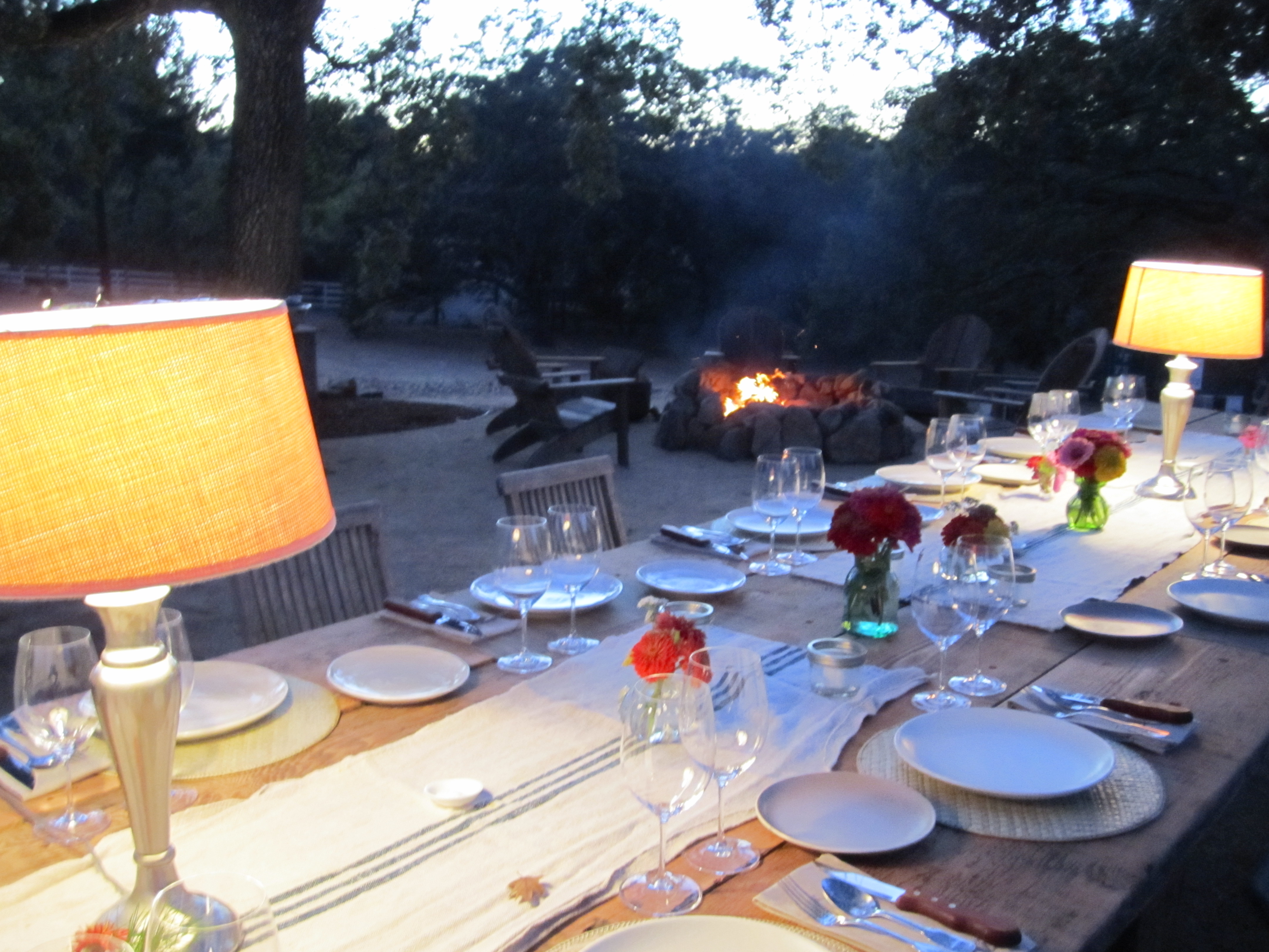 To cap off a day that couldn’t seem more perfect we arrived at the home of Annie and Andy to find a scene straight out of Martha Stewart Living. In the expansive back yard the light was dimming over Annie’s outrageous garden filled with vegetables and flowers and the chickens were safely in their coop. There spread before us was the most gorgeous table and an entire kitchen island set under the trees. Electric lamps, flowers, plates of food, a tire swing, a roaring campfire off to the side and even better some Leroy Bourgogne Blanc that Annie’s sister Brigit was kind enough to bring for us. One of the wines she sells, it really hit the spot as a palate cleanser after a day of heavy Cabernets (although Larry Hyde’s Chardonnays were similarly refreshing). While we snacked on olives and almonds and a squash soup from the garden Andy pulled out a bag of padron peppers not to be believed. Those peppers, to which I am addicted, are about $6 for a bag of about ten at the Ferry Plaza Farmer’s Market. And I pay it gladly! He sauteed them up and we all dove in (and I again could NOT stop.) They are fun little things, you can eat ten and just enjoy their nuttiness and then one will just wallop you with intense fiery flavor! It’s fantastic and very much a pleasure/pain thing.