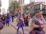 The “Flash Mob” started out to be a couple of purple people milling around while a DJ spun tunes for some interesting dancers, not affiliated with our group… one woman moving her ass like nothing I have ever seen. It was a pretty interesting scene. Slowly the group started to meld and get to know each other, not really by name save for a few asking who the hell we were and how we knew Stuart, but not in an adversarial way, just in a curious way. As we gathered people asked to take our photos and I enjoyed being the subject in all my peacock finery. Finally our fearless leader Stuart arrived with a scepter of ribbons and we started our procession along the streetcar tracks to Chickie Wah Wah, a bar up Canal Street. Along route we chatted and one woman asked how we had ended up here. When we told her of our chance encounter at Sugar Park she said, “Lady NOLA either loves you or hates you, and if she loves you she takes care of those types of things.” She said very matter-of-factly, “She must love you.” It was a pretty long walk before we were able to get on a street car that was mostly full, but it was so fun to see the reactions of the riders as we filled the red car with purple plumes, sequins and satin. Dripping feathers and sequins, we got off the streetcar to cheers as we met up with the rest of the Purple People and entered the bar where Tribe Nunzio was playing for us. Purple punch was available and my first King’s Cake was presented, made by Stuart himself. Kimberly and Killian arrived, rejuvenated from the previous night, with purple eyelashes for us. A gender illusionist named Pickles gave Tracy, my new friend Desier and me a makeup lesson in the ladies room and we drank lots of beer.