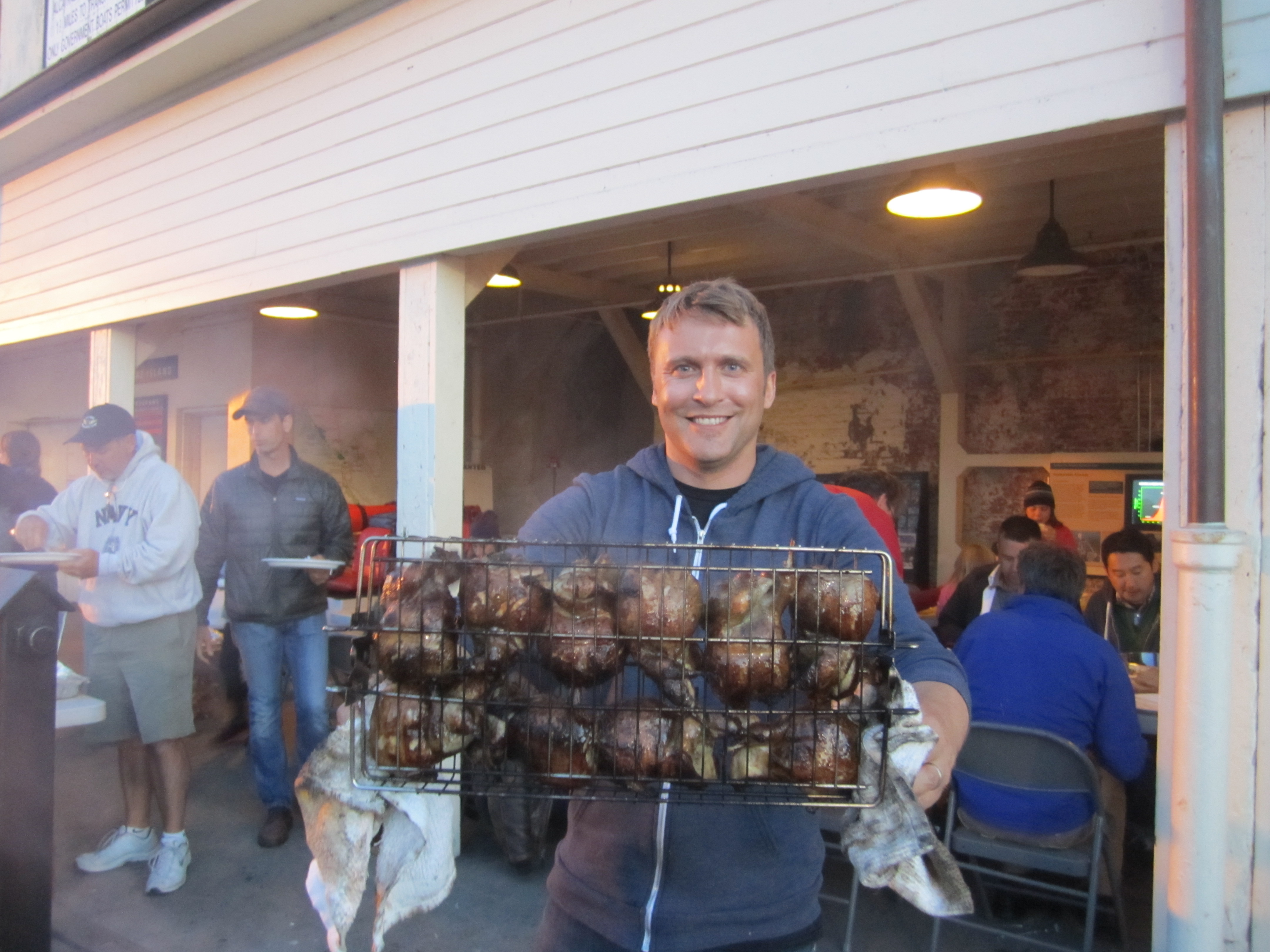You can’t tell three ambitious top chefs from San Francisco to grill hot dogs and burgers, so for the group of 35 the chefs had some pretty extensive dishes planned, thinking we had something a bit bigger than the teeny grill we were presented with. The grill was made by the last group of prisoners on the Rock. Luckily the team are professionals and made it work, but it wasn’t the ideal condition to make an extensive meal! Peter McNee made “Jail Birds” (quail in little cages grilled over the charcoal) served with fresh red cherries, arugula and almonds, and he even went on to make an amazing hot chocolate with whipped cream and a zabaglione atop strawberries for dessert! A huge challenge and a lot of effort to do over a charcoal fire. Arnold Eric Wong had amazing pulled pork with a selection of great sauces and fresh herbs served in traditional steamed Chinese buns. The amazing thing is that they were steamed on location, once again over the open fire. He also made a great Kombucha that paired perfectly with all the dishes and provided a great alternative to sodas. Chef Hoss provided a selection of amazing pickles, white strawberries, fiddleheads, etc. and then presented a cold yogurt soup with raisins, nuts, rose and herbs. The kids in the group were eager sous chefs asking for jobs at every turn, and even tray serving soups! Then Hoss brought out his lamb shank meatballs, aka the “Ball and Chain” and he had dressed the part in black and white stripes!