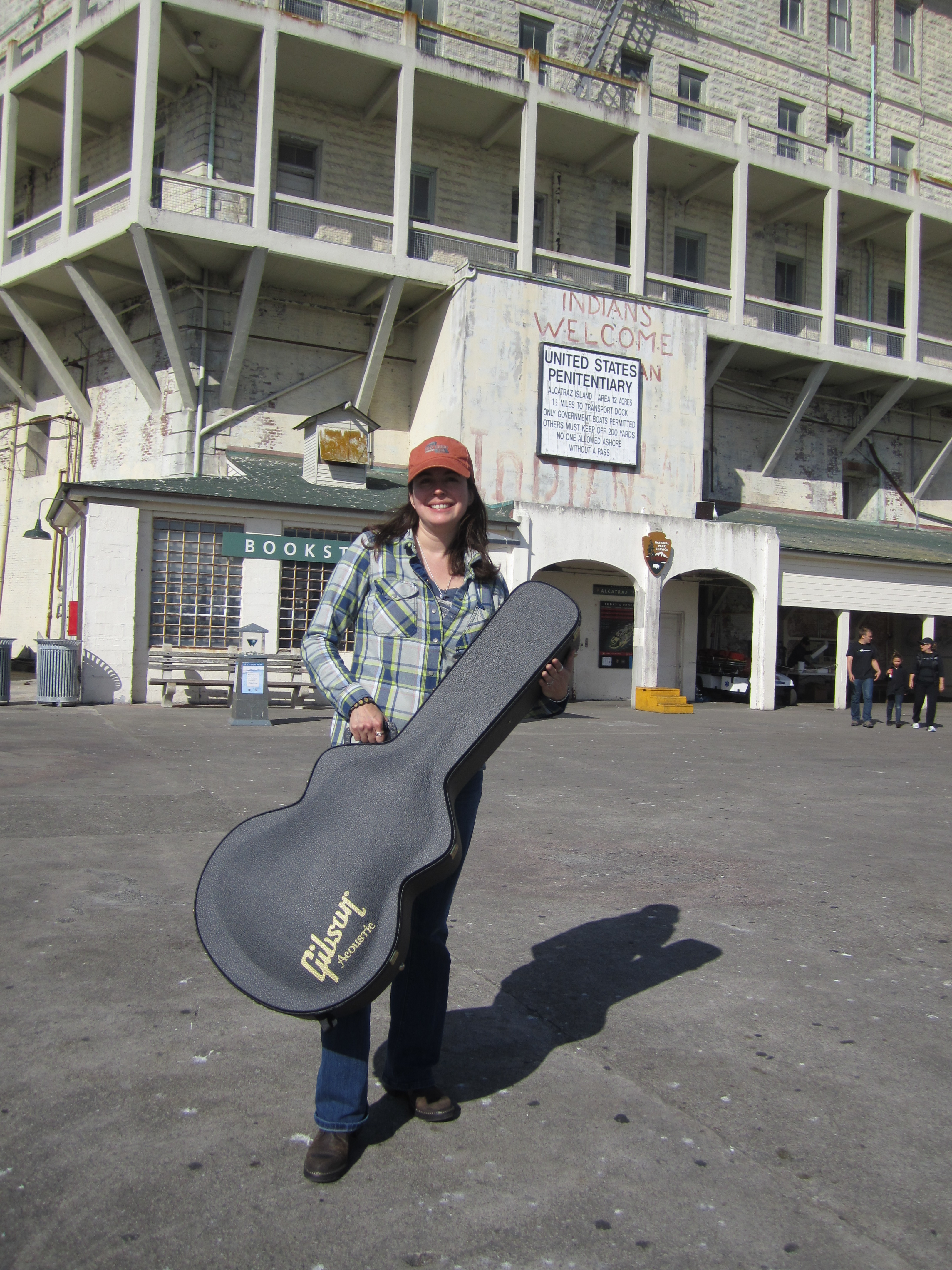 While we enjoyed dinner we noticed the last boat leaving, all the workers, every last one, except for the one security guard and John were gone… When dinner was done I grabbed my guitar and was invited to perform my “Pork Song” and then an encore of “You Gotta Go to Sea”, which was so fun, the Ranger held up a microphone for me and said, “Live from Alcatraz, Rebecca Chapa!” Hoss provided cheesecake and then everyone milled about until we could clean up. The greatest part was that the entire group cleaned up together, such an amazing group, we were all in this together, rather than workers and guests. In a way, we had become a family!