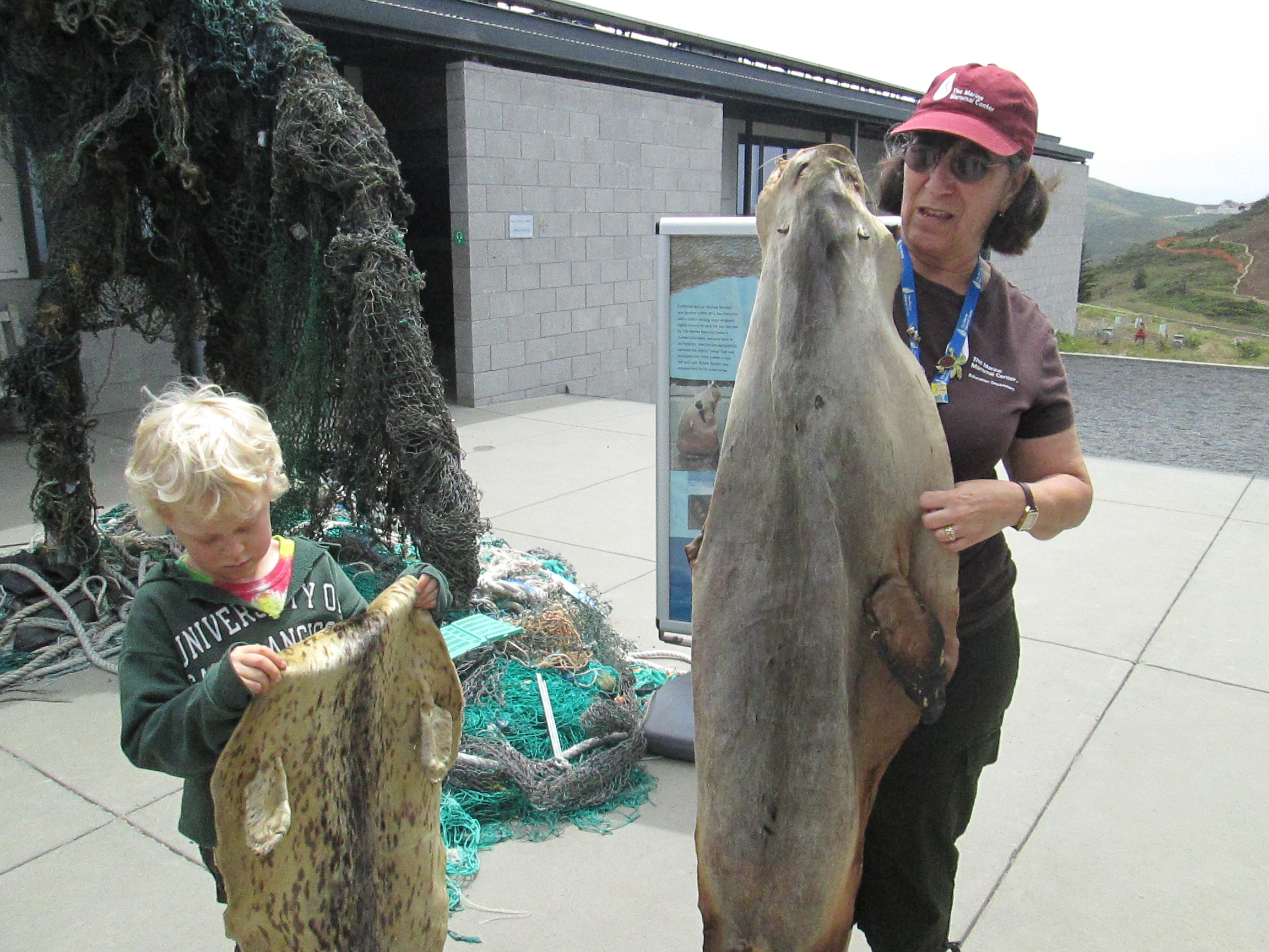 Many of the displays at the center help raise awareness as to how fragile the marine environment is, and how easily humans can harm marine mammals. Packing straps can confuse animals as they play with them, possibly eat them or become strangled in them, and plastic bottles and discarded bags can easily injure or strangle seals and sea lions. A very striking exhibit called The Ghost Below shows how ghost netting discarded or lost in our oceans can injure sea life. These nets can float for years. Richard & Judith Lang created the exhibit with just part of 450 pounds of ghost net and trash that were found inside a dead sperm whale. Their new interactive exhibit, Indra’s Net, was recently installed and allows messages of hope to be left for animals in distress.