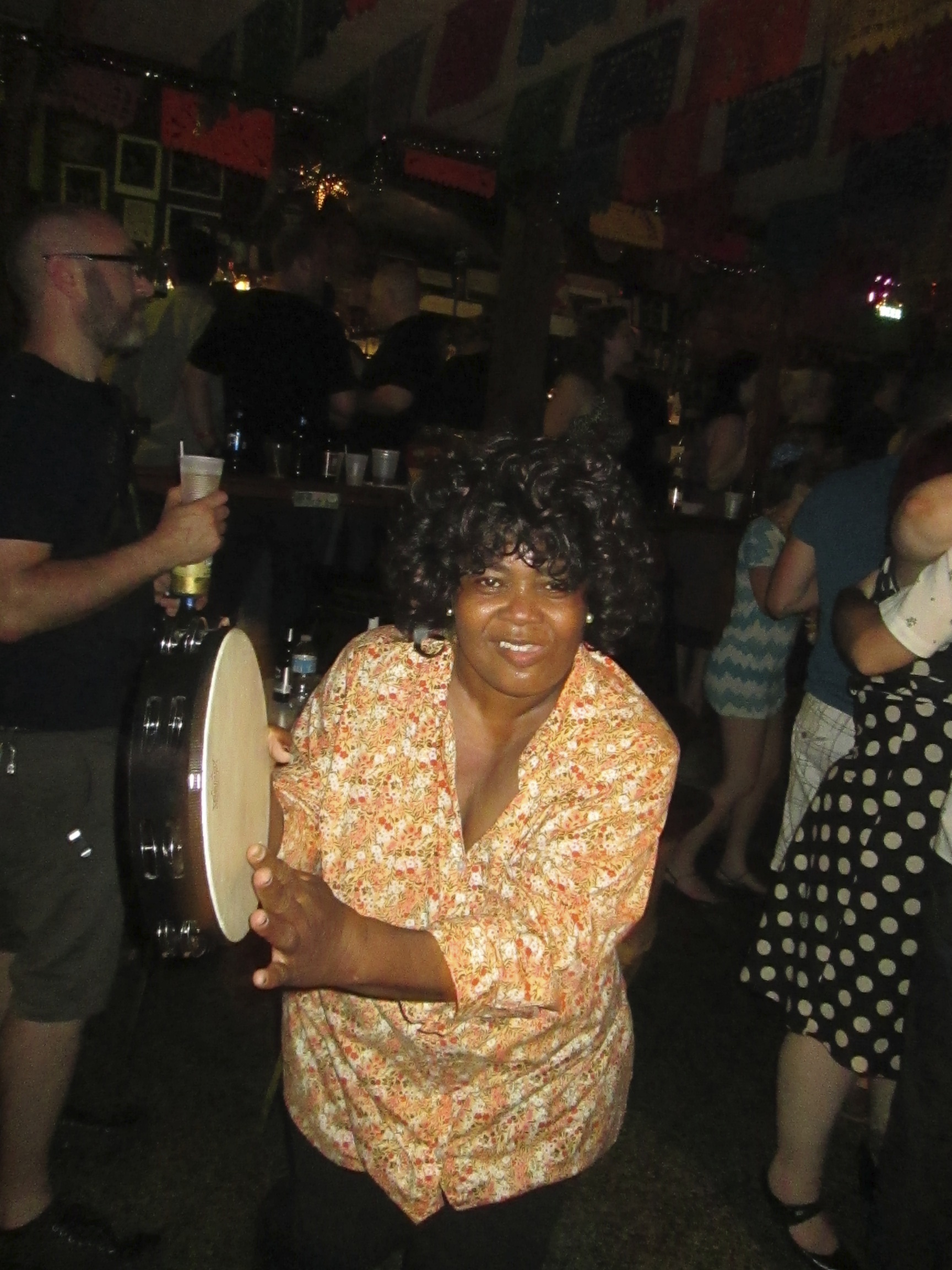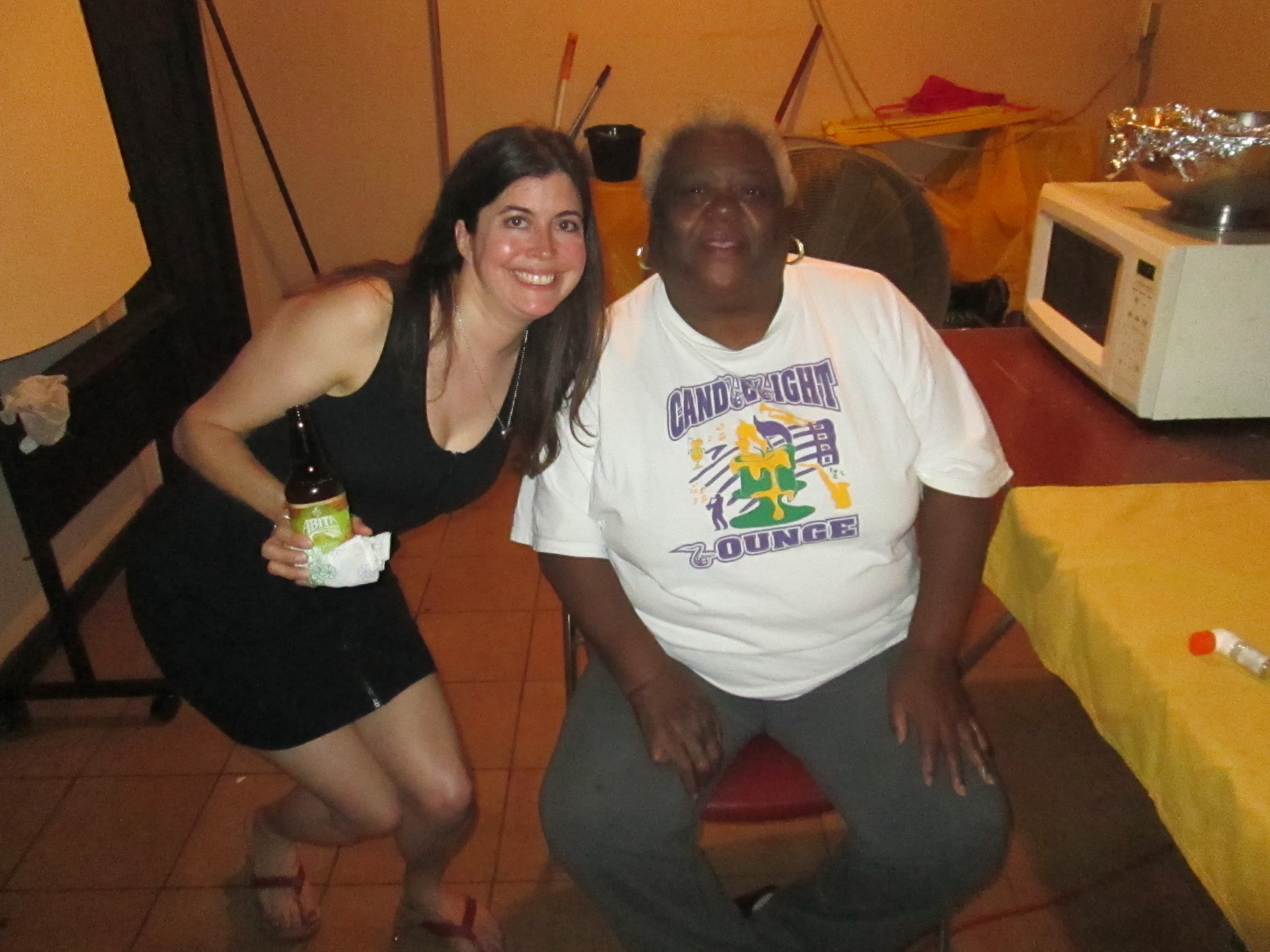 Uncle Lionel likes the ladies so was available for a few photo opportunities and the entire group at the Candlelight was in great spirits. I watched as a man walked in, a lady on one hand and a cigarette in the other. He accidentally touched it to the arm of the woman working there as they hugged, she hollered at him jokingly and he walked to the bar smiling. I smiled at her good nature and offered my icy MGD bottle to soothe her arm where he’d burned her. She said to me, “You know who that is? That’s Kermit Ruffins! He’s my ex-husband! I told him he can add some money to the alimony check!” For those not in the know Kermit is one of the most amazing jazz trumpeters and musicians. After a bit more sitting the Woman Whose Ex was Kermit demanded that we get our asses out of the chairs and get up and dance, so we did, and I saw a woman give the most amazing tambourine performance ever. I am not sure who she was but she joined the band for just one song and was hitting the tambourine on every possible surface of her body, each time getting a different sound, all the while with the most exhilarating beat. The whole scene just brought pure joy, vibrancy and an electric feeling of being alive. It was really amazing. As the night wound down I headed to the restroom while my friends began to chat with the owner of the Candlelight. I had heard rumors of the importance of the Zulu Coconuts and had secretly thought how amazing it would be to get one, but tried not to be so needy, so wanting, and since Mardi Gras was over I thought I would have to wait for next year. Much to my dismay as I exited the restroom I watched in awe as the proprietor of the Candlelight handed coconuts to Vince and Julie. I headed out front to meet my other friends, trying not to be jealous and finally just coming to terms with it. I have learned recently that wanting is not a way to get something, but to be grateful and happy with what you have is much more productive. So although it was hard for a second, I decided that this was not my time to get my coconut and to be happy for my friends who did. The minute my mind was set on this path the door of the Candlelight opened, and one of the staff came up to me. She said, “They want you in there.” and turned around. I followed her back into the bar and she led me to Leona Grandison, the proprietor. Leona asked me a few questions, I guess to gauge my sincerity and worthiness. I can’t remember exactly what she said I was in a very intense state. I think it was something like, “Do you like it here in New Orleans? Where you from?” I explained to her how special her bar had become to me, I told her that I was at the same time filled with joy and remembrance of my friends lost, just basically feeling alive, I think I tried to explain how I felt in the City of New Orleans. She motioned to a woman, who I think was her daughter, and pointed to a shelf behind the bar. She brought a coconut over to Leona and placed it in her hands. It was a surreal moment as she transferred it to mine, almost as if for safe keeping. I was almost on a different plane, but I think that as she gave it to me she said something like, “You come back now, I expect to see you back here.” And that was it. The most amazing end to my Mardi Gras.