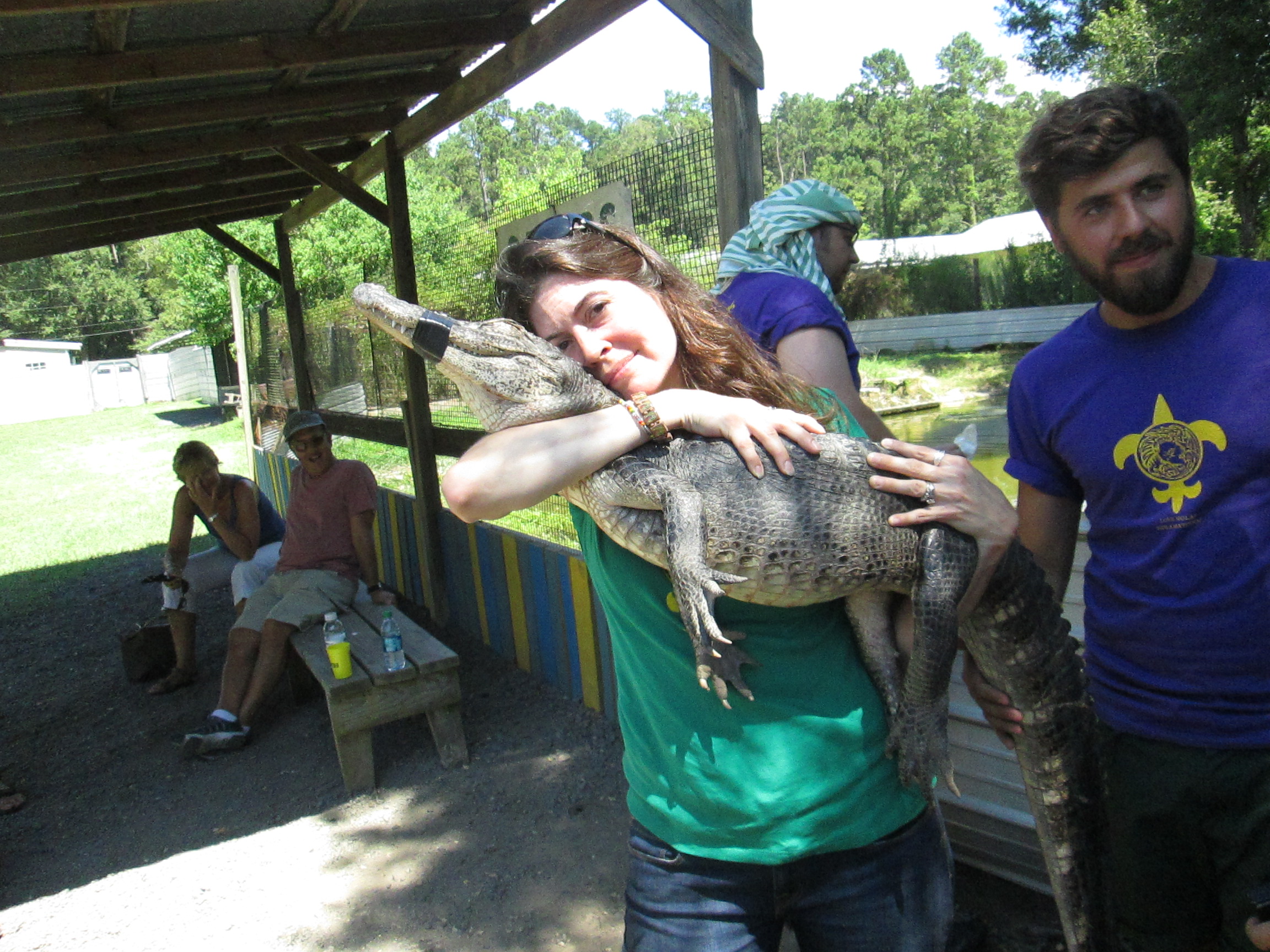 After the demos with the bigger gators we had an opportunity to hold a smaller one whose mouth was taped. At a certain size and weight they become difficult to hold since they can writhe their bodies in a rolling motion and have an incredible amount of strength as they grow to a certain size. This gator was really sweet and really felt incredible in my arms. His skin was bumpy but had a strong smoothness to it and was surprisingly enjoyable to hold. After I was forced to give the gator back I also met a cute pot-belly pig named, of course, Glitzy.