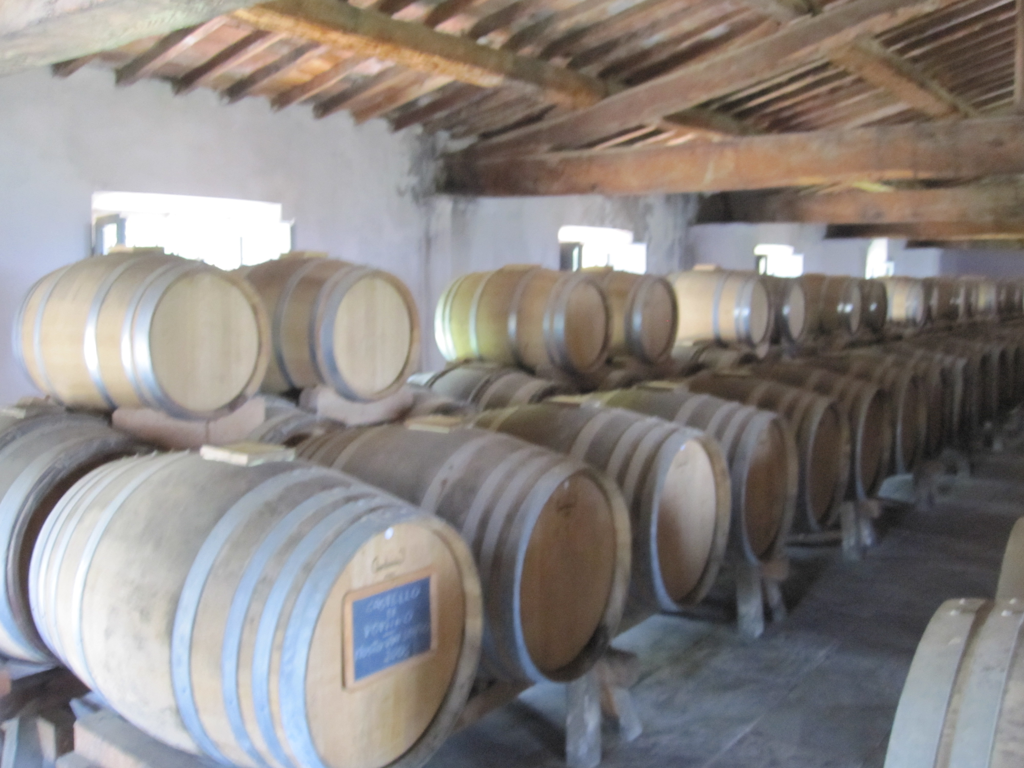 Most exciting for me was the Vin Santeria, or the room where Vin Santo is produced. Here they take harvested Chardonnay and Trebbiano grape bunches and hang them from wooden rafters with hooks. The grapes stay there for about three months, in the fall and winter and most importantly this room is up high and has windows that are opened to allow for breezes, always strong in Pomino, to dry the grapes and also prevent spoilage. After pressing the juice is put into exile in barrels (Caratelli sigillati) 2/3 filled where it ferments slowly. They close these barrels with wooden tops and try to forget about them for four or five years (they cannot reopen these to check on the wine.) When they revisit the wine it has evolved into a coppery toned elixir that is sweet (180 g/l residual sugar) and luscious. We tasted a Chardonnay that they oak and lees stir to produce Benefizio and also a Pinot Noir out of barrel that had a tart cherry nose and a concentrated core of fruit but was unique to Pinot Noir from other wine regions.