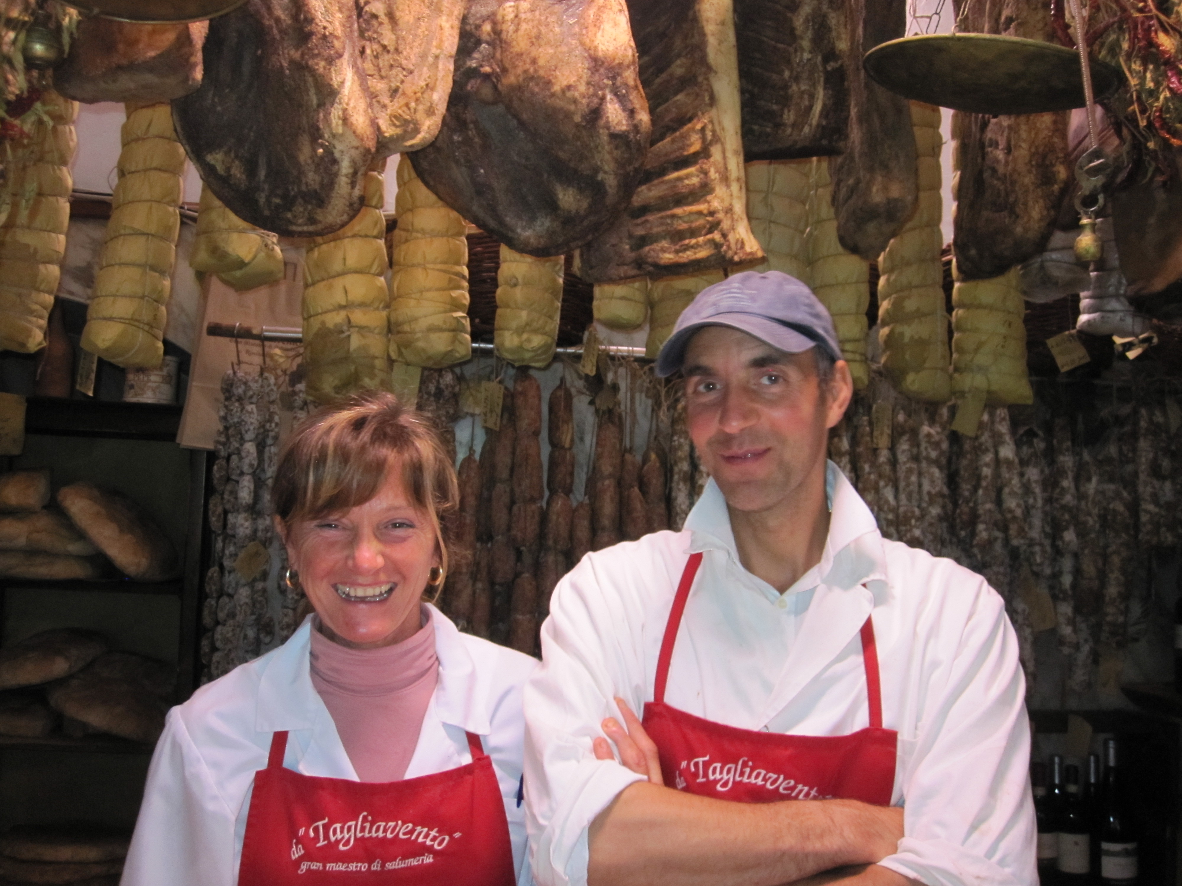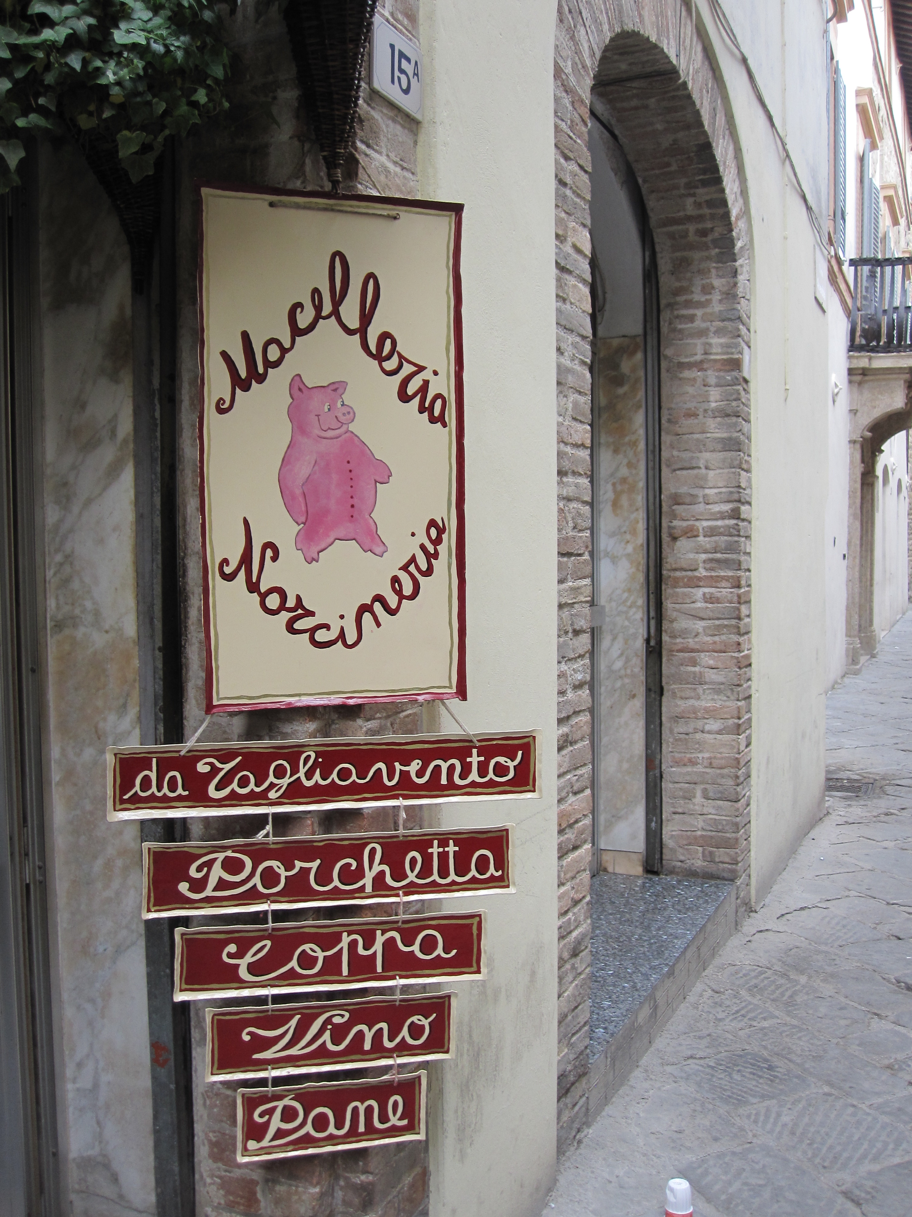 We entered and our senses were overtaken by the rich smell of all the hanging meats. I was of course in hog heaven. We were treated by a selection of items, Pancetta made from a slab of the pig that is salted and then rolled and wrapped in paper and hung to age, Lonza, the loin of the animal, Ciauscolo which is a fattier sausage, Porchetta, and my all time favorite, a dry salsiccia aged with Montefalco wine that had a much harder and chewier consistency and incredible flavor. Owner Rosita Cariani is a fourth generation producer of these products while her partner whose name I did not catch is only third generation, so basically it seems that she is the boss of the place. They noticed how excited we all were to taste and so they sliced thinly some Coppa di Testa, basically a head cheese usually made in winter that includes all parts of the animal, the guanciale (cheeks), head, gelatin, etc. along with garlic, orange rind, lemon rind and nutmeg. They were sure to come out and show us the type of garlic, red garlic, which seemed to be very important to the production of this product. It had a melt in the mouth texture and was just delicious, I think the reason I haven’t enjoyed many head cheeses in the past is the chunky fatty globules that don’t seem quite appetizing, but this texture was just perfect. We ended it off with a well-aged pecorino, a sheep’s milk cheese aged and rubbed with olive oil. And of course we had to accompany this with some Arnaldo Caprai Grecante. The reception at this wonderful Nocineria was so warm and friendly, with that the wine and cheese and these amazing meats I would have been happy to stay there all day. They also sold fresh cuts of Chianina beef and the local specialty, lamb. When we shook hands I could not help but notice and feel comforted by the super soft buttery feel of these hands that not only butcher, but craft such exquisite and time honored recipes. I have always loved salumi, but lately in San Francisco it has seemed overdone, but now I really understand the passion that is imbued in those who have visited an authentic Nocineria and understand their quest to emulate such a place. It was truly magical. And I was so proud to be wearing the jacket from my friend Stephen Gerike of the National Pork Board that features his own farm’s logo, Boris Max. If you visit the store is called “Da Tagliavento”, Gran Maestro di Salumeria, Corso Amendola, 15/a Bevagna.