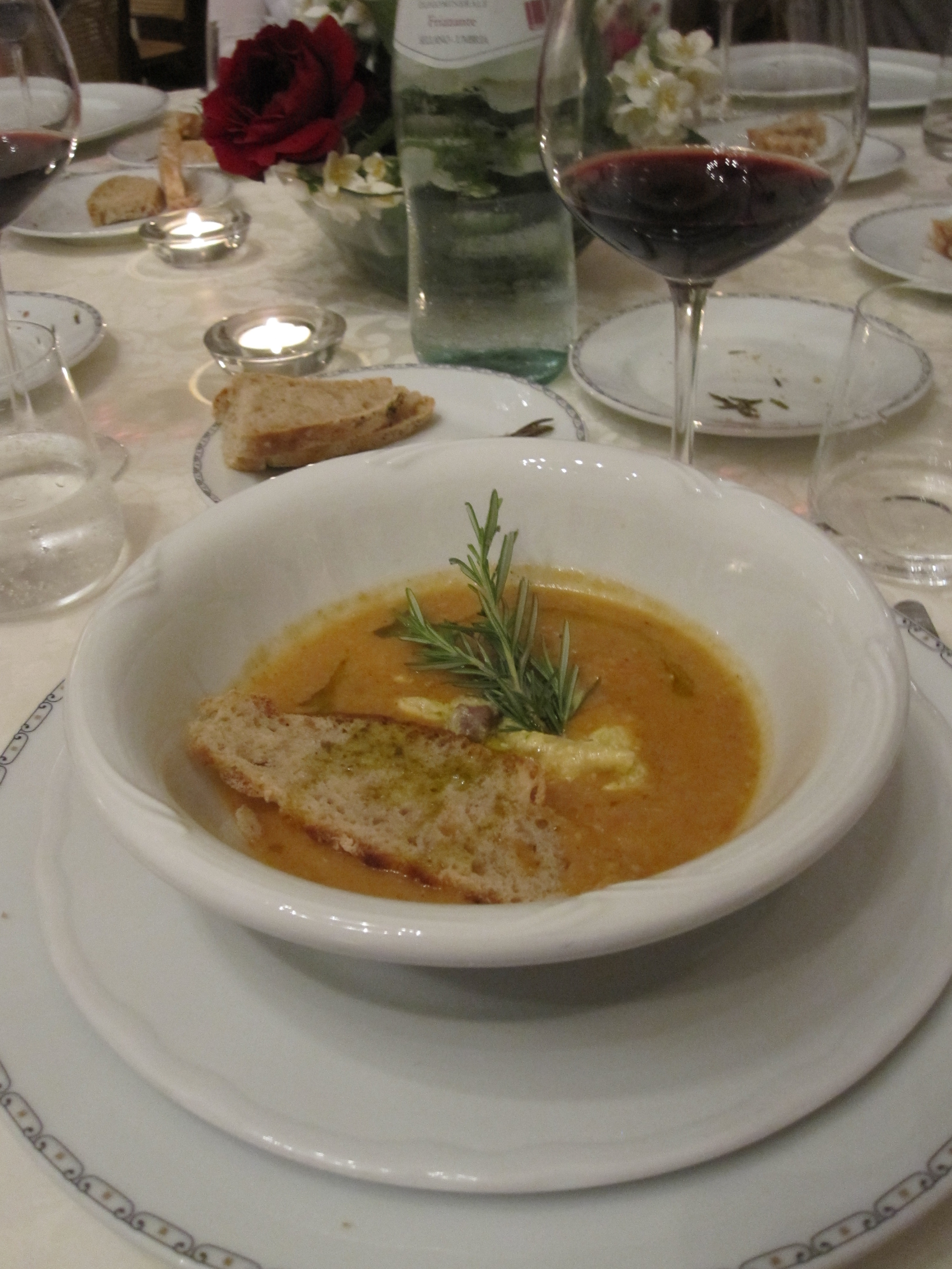 We finished up and after a quick nap at the hotel it was back to eating. We arrived at the beautiful Villa Roncalli where chef Maria Louisa created an exceptional meal for us. We drank the Arnaldo Caprai Nero Outsider, a lush expression of Pinot Noir with an amazing Chianina meatball with capers and shaved parmesan on super fresh lettuce. Monkfish with tiny slivers of zucchini and fried squash blossoms with Arnaldo Caprai Montefalco Rosso Riserva 1998 was amazing, but the Farro soup with many drizzles of olive oil and ricotta ravioli stole the show along with the Arnaldo Caprai Sagrantino di Montefalco 1997. This was where it became evident that although the soup was super rich the wine just lifted it and made the meal work. Amazing that such a huge wine could be a delicate foil for a rich dish, but the tannins wafted away and you found that you could not help but drink the wine, food, wine, food, wine, bite, sip, bite, sip, the way it was intended. Pigeon was served with a thick noodle and then a lamb (I got the shank) but by that time I was done. Until of course we were presented with more Sagrantino di Montefalco passito with one of the best desserts I have ever had, pears delicately poached with a semolina type cobbler type thing on them sitting in a bed of zabbaglione served with what to me tasted like an eggnog type ice cream, no doubt just a rich egg base with some nutmeg. And just like Marco said, it was incredible with the passito, amazing! To top off the evening their dog came by to say goodnight and we retired back to the hotel where I slept like a log.