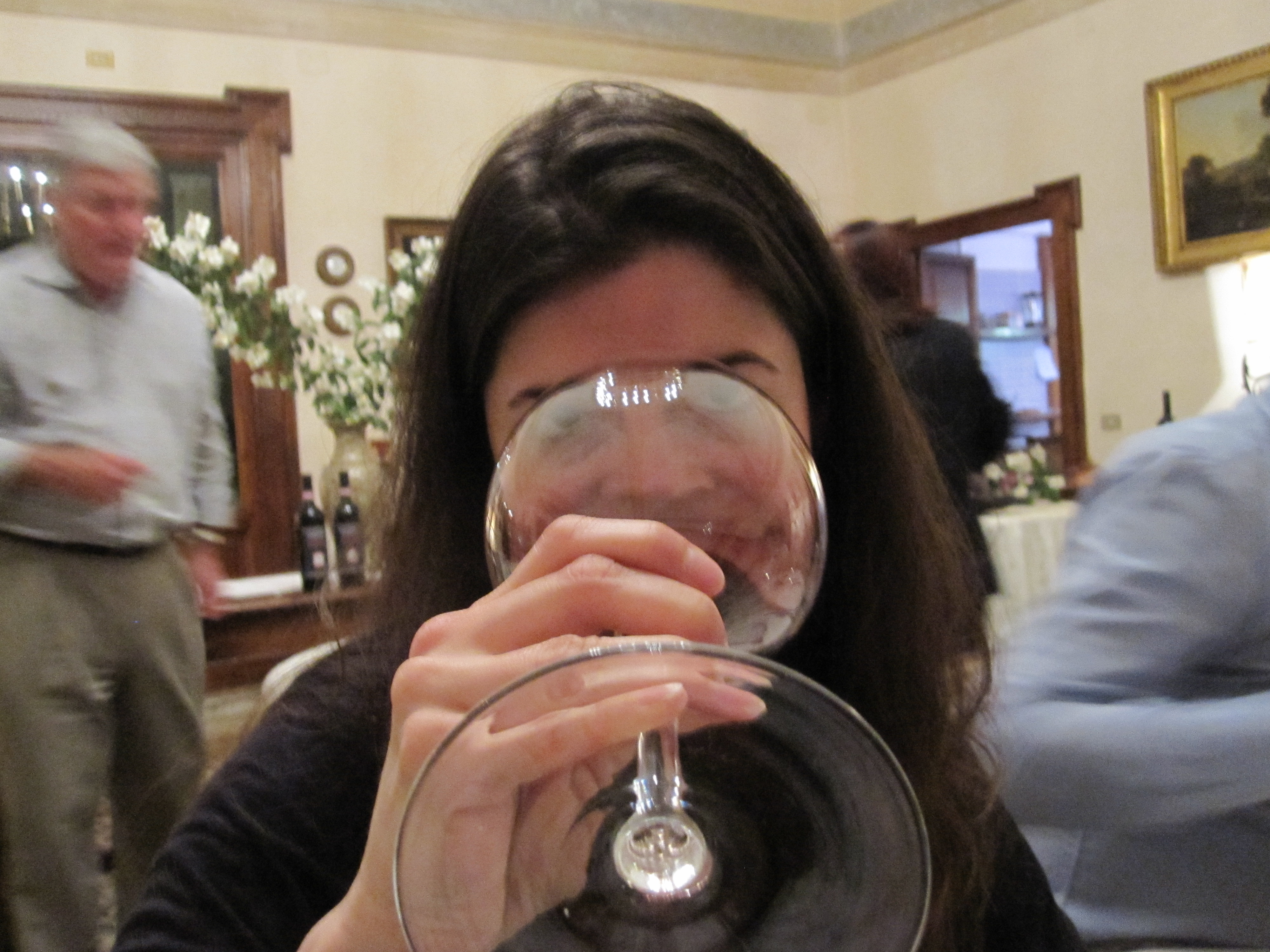 We entered the villa and were met by Leonardo Frescobaldi, the President and tasted through the Mormoreto 2006, 2007 and barrel samples of the 2008 and 2009. The wines are a blend of Cabernet Sauvignon, Cabernet Franc, Merlot and Petit Verdot which seems strange until you learn that these grapes were grown on the property for ages. Due to unfavorable relations between the Frescobaldi family and the Medici some Frescobaldis left Italy for a time and spent time in France. One of these ancestors was famed for bringing back these grapes in the 1850s along with some Pinot Noir and Chardonnay now planted in the neighboring area of Pomino. The Colors of the wines were intense hues of magenta and just as Niccolo had suggested the aromatics were astonishing. Aromas of mulberry, blackcurrant, resinous herbs jump from the glass and despite the Bordeaux varieties have no resemblance to Bordeaux. Lifted by vibrant acidity and balanced in their oakiness (the Marchesi de Frescobaldi says “If you like vanilla go buy a vanilla ice cream”) these are wines great for a meal.