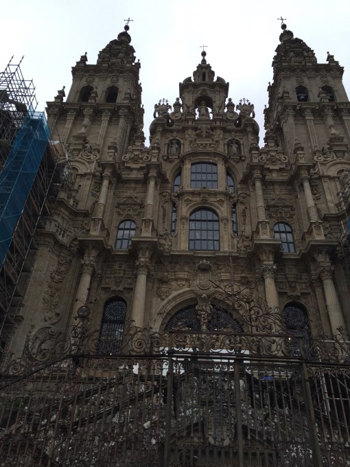 We knew next we should get our Compostela, the stamp and document that says you did it. We saw signs for the tourist office and went there. We got a map but kept getting lost. Pilgrims we asked didn’t seem to speak English. We were cold, tired and starving and luckily out of nowhere appeared our Italian friends from the last few nights! They’d ditched their bags already and knew where to go so we headed to the office. The line went around the courtyard and wove through the building. They told us the usual wait is 1 hour. We waited over 2 hours. I was too tired to talk, I didn’t even know what emotion I was feeling. Suzy kept up a conversation with the Italians, in French. Our feet were sore, I still had my pack on as it was easier than removing it. As we got closer to the front the group became friendlier. The group in front of us was from many different states in Mexico. Some people asked us how far we’d walked and were astonished to hear our grand total (according to my iPhone) 829.12 km or 518.2 miles.