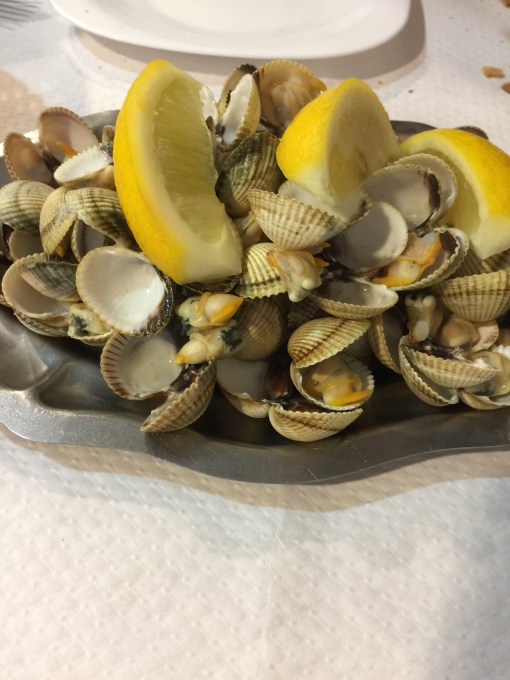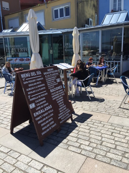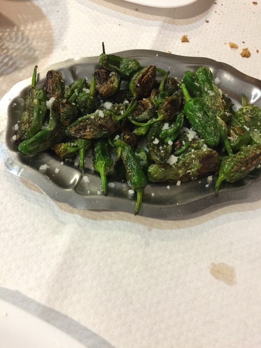 We’d seen a cute yet nondescript lunch counter type of place and we located it again. The wife owner was eating her lunch at a table and watching old Westerns dubbed in Spanish. The lights were out. We walked in and asked if they were open, she asked what we wanted and we said everything! Her husband had been in the bathroom but came out and suggested padron peppers, navajas (razor clams) and berberechos (cockles). We said sure. He offered us some mussels in a red sauce and we got a bottle of white Ribeiro wine outed into small soup cups. We began to become human again. We devoured the food and then ordered empanadas is bacalao and langostinas. Manuel the chef and his wife Manuela have owned the place for 27 years.