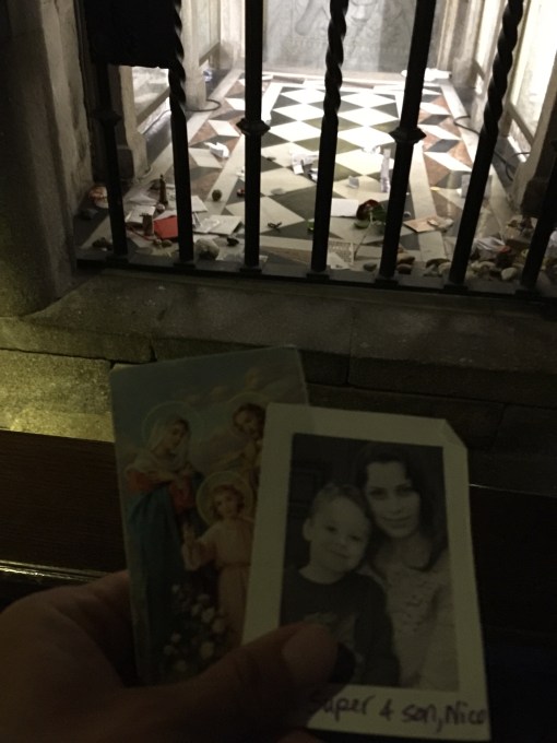 Soon it was almost 7:30, time for the pilgrim mass. I got a text from my friend confirming that Daniel had passed away. I headed into the cathedral and stumbled upon the crypt where St. James is buried. I left two of the things I’d carried the whole way, a prayer card from our beloved and missed Tomas Bermejo and the photo of Laura Super. I cried as I placed them inside the bars of the crypt and knelt, on the good knee to say a prayer. Mass was nice and I received communion, there were lots of people there. Again I was all emotion tears falling onto my pants and the floor, unable to control it.