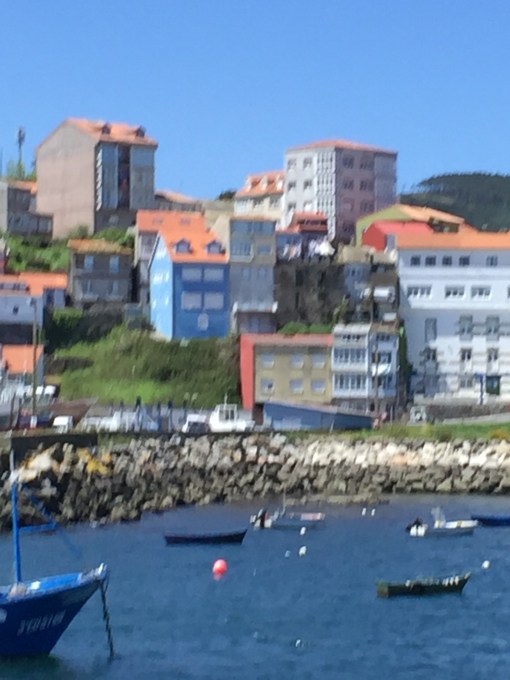 We got caught behind some smokers and so we sped up past them. It was raining a bit and the streets were slick. We wove up and around cafes and souvenir shops and on into the town. The shell markers were surprisingly hard to keep track of. Some were missing. A woman had to point us in the right direction. A restaurant owner yelled at us for walking in the street when we were trying to pass a woman chatting on her phone and hogging the sidewalk. It was gray and drizzly.